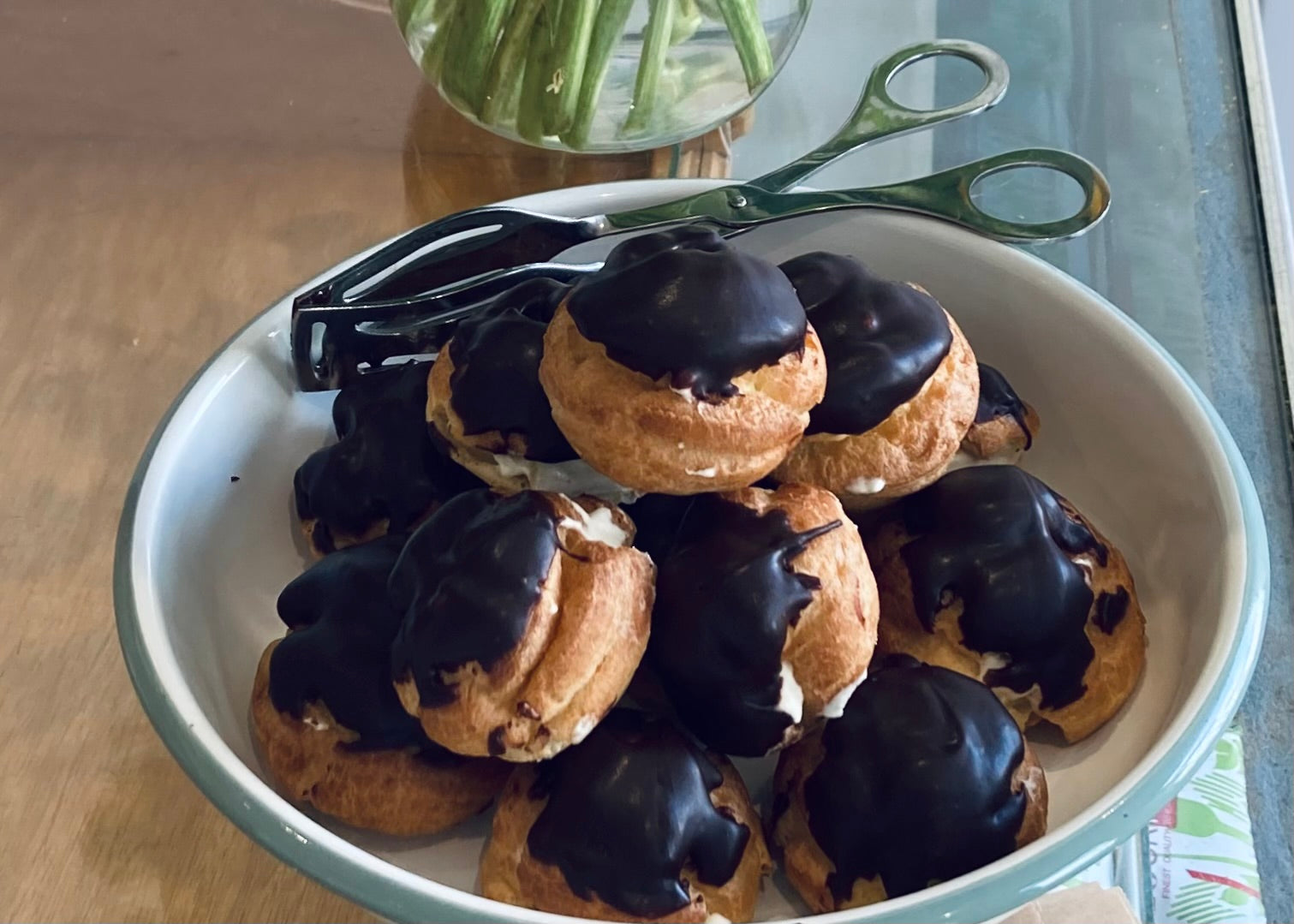 soesjes met een laagje chocolade, gevuld met crème diplomat.