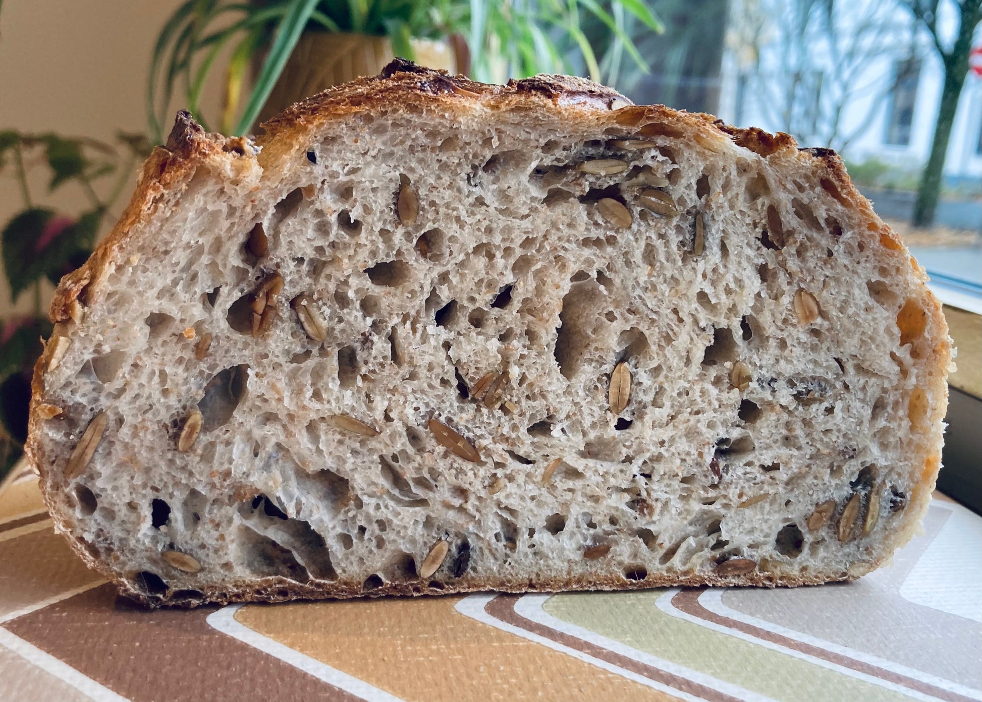 op steen gebakken desembrood boordevol pompoenpitten.